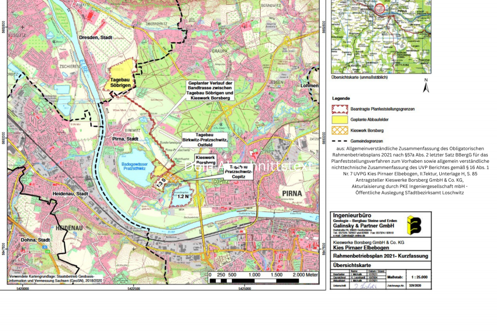 Die folgenden Fotos stammen aus der im Internet zugänglichen „Allgemeinverständlichen Zusammenfassung des Obligatorischen Rahmenbetriebsplans 2021 sowie aus der allgemeinverständlichen nichttechnischen Zusammenfassung des UVP Berichtes Kies Pirnaer Elbebogen II Tektur – Aktualisierung Unterlage H vom 31.05.2024 (Antragsteller: Kieswerke Borsberg GmbH & Co.KG Pirna). Unter den Fotos steht die Seite, auf welcher diese Tabelle oder Karte zu finden ist. (Unterlage H und alle anderen Unterlagen zu finden unter: https://www.uvp-verbund.de/trefferanzeige?docuuid=ea15a035-b2db-4512-a3df-63da8c23bae0&rstart=10, Stand 09.11.2025)